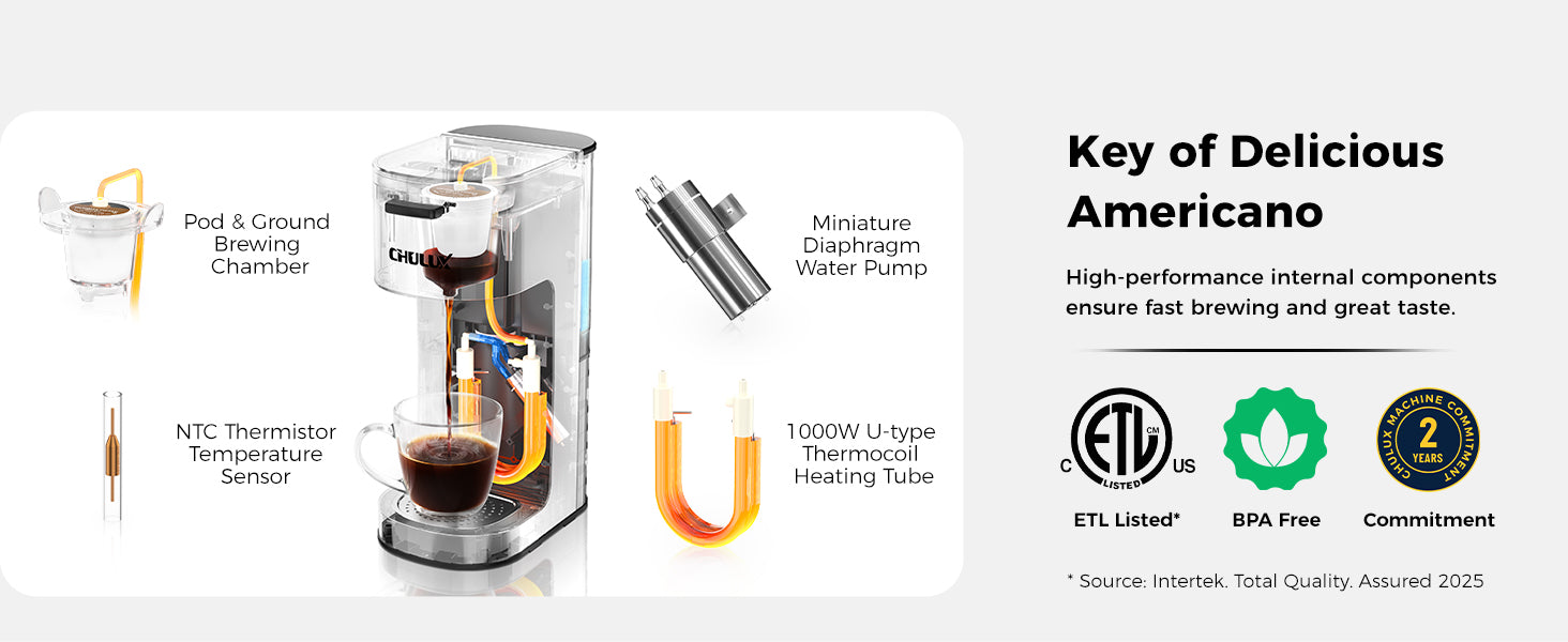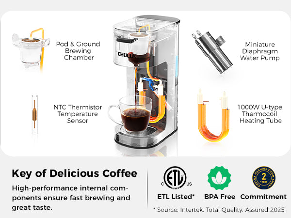 With a 1000W rapid heating element, this K cup coffee maker delivers a full 14oz cup in just 2 minutes. Smart NTC temperature control ensures an optimal and consistent brewing temperature for extracting the richest coffee flavors. The CHULUX Slim-Pro Single Serve Coffee Maker for K Cup also features an auto shut-off function after 2 minutes of inactivity to conserve energy and provide peace of mind.