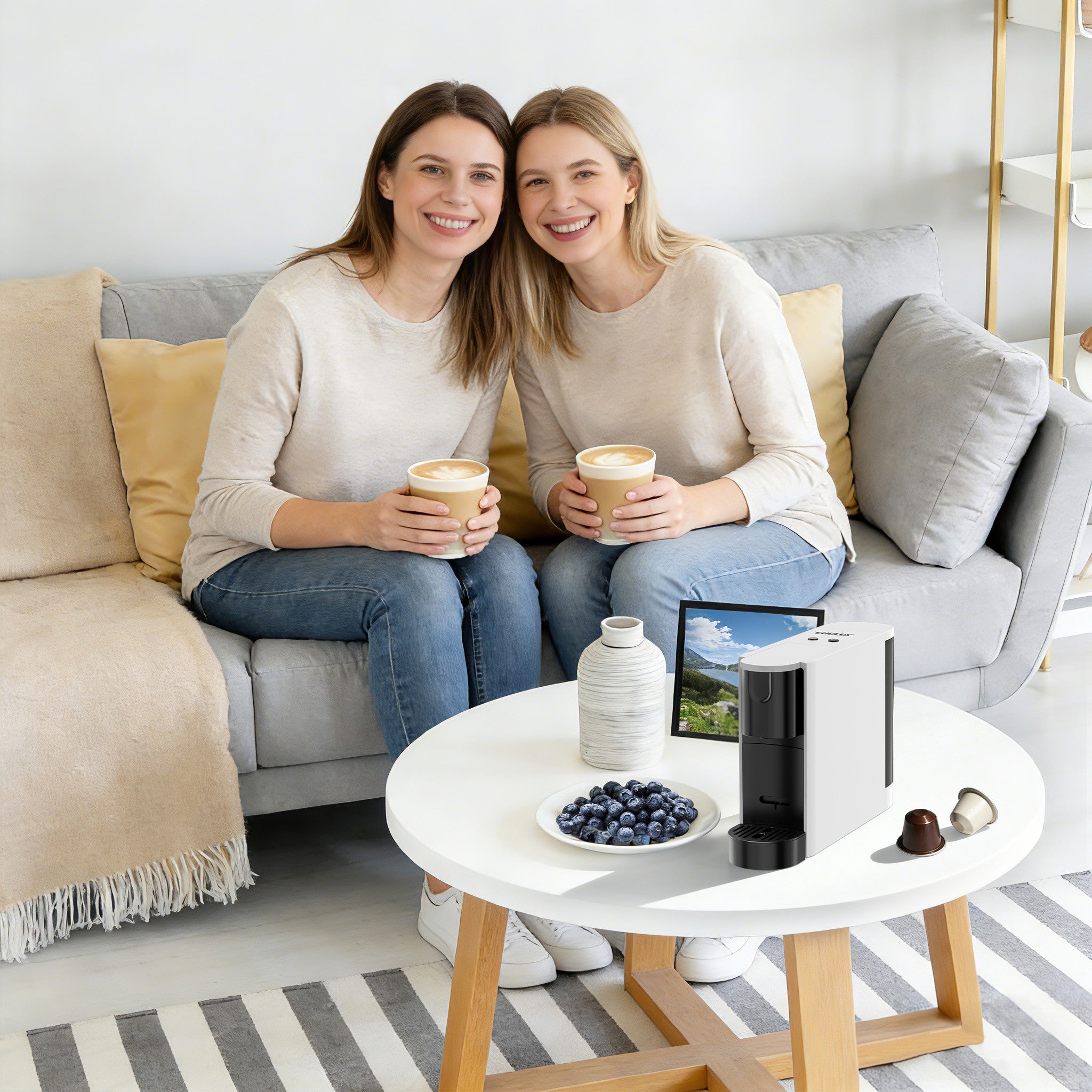 - User-Friendly Design: Open the lid after brew, and used capsule auto drop into the collection bin; The machine also auto-shuts off after 5 mins of inactivity to save power; Plus, it features a descaling function—simply add your descaling solution and run the program