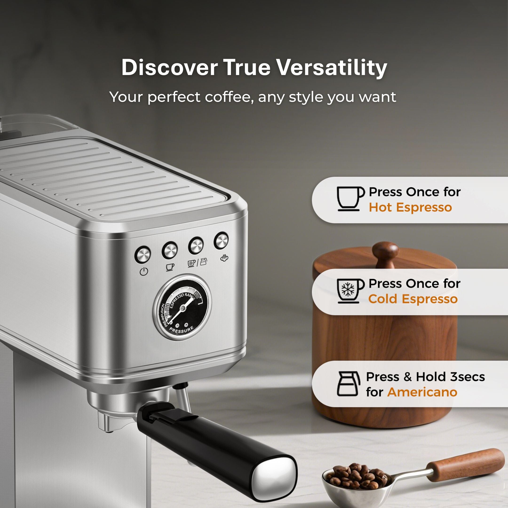 Focus on Extraction: Features include a real-time pressure gauge for monitoring extraction pressure, a pre-infusion function for balanced extraction, and other user-friendly touches like a 40 oz water tank (no frequent refilling), 25-minute auto shut-off for safety, and a removable drip tray for easy cleaning.