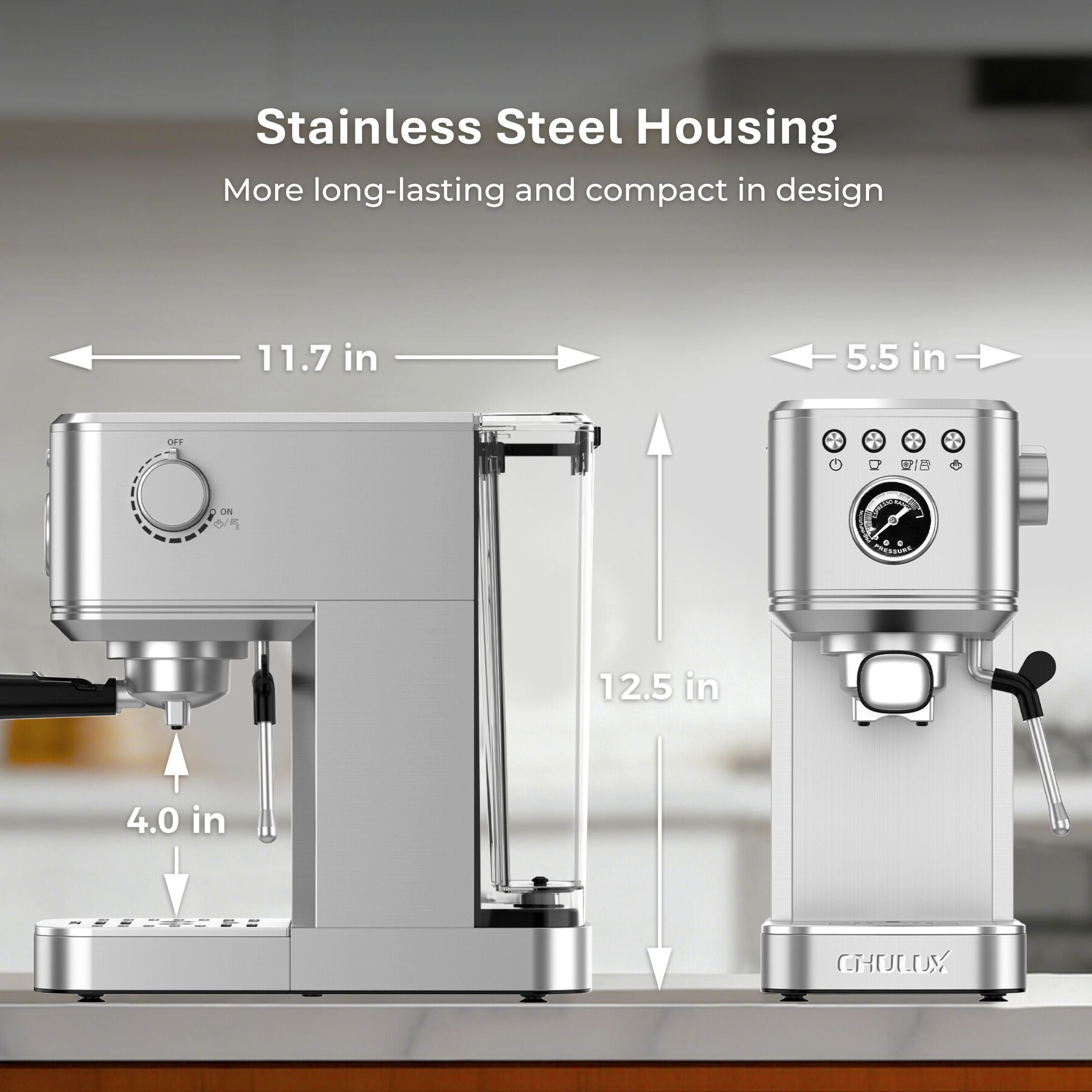Professional Pump: The CHULUX Semi Auto Espresso Machine comes equipped with a 20-bar original Italian pump, ensuring easy extraction of strong-flavored espresso with rich crema.
