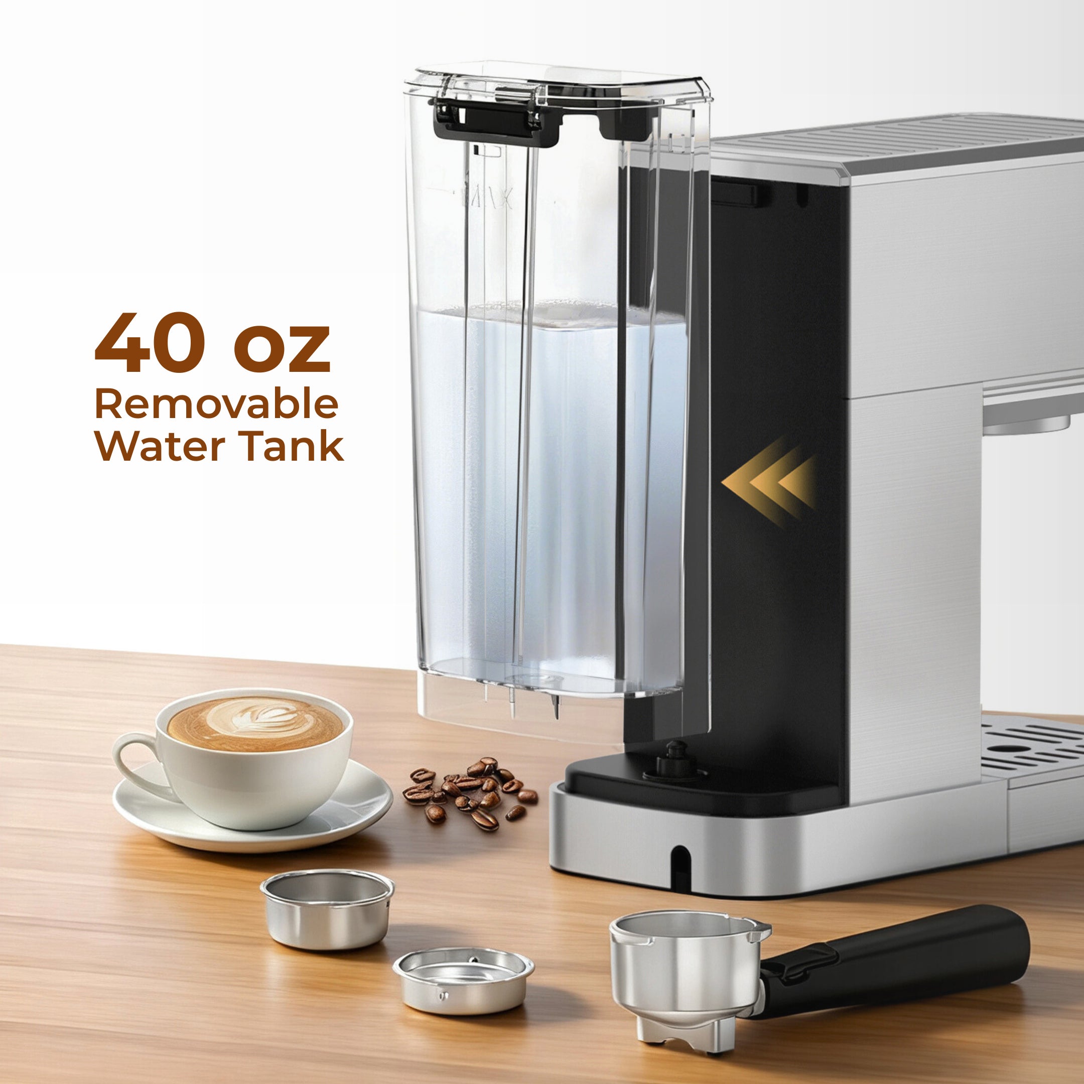 - Focus on Extraction: Features include a real-time pressure gauge for monitoring extraction pressure, a pre-infusion function for balanced extraction, and other user-friendly touches like a 40 oz water tank (no frequent refilling), 25-minute auto shut-off for safety, and a removable drip tray for easy cleaning.