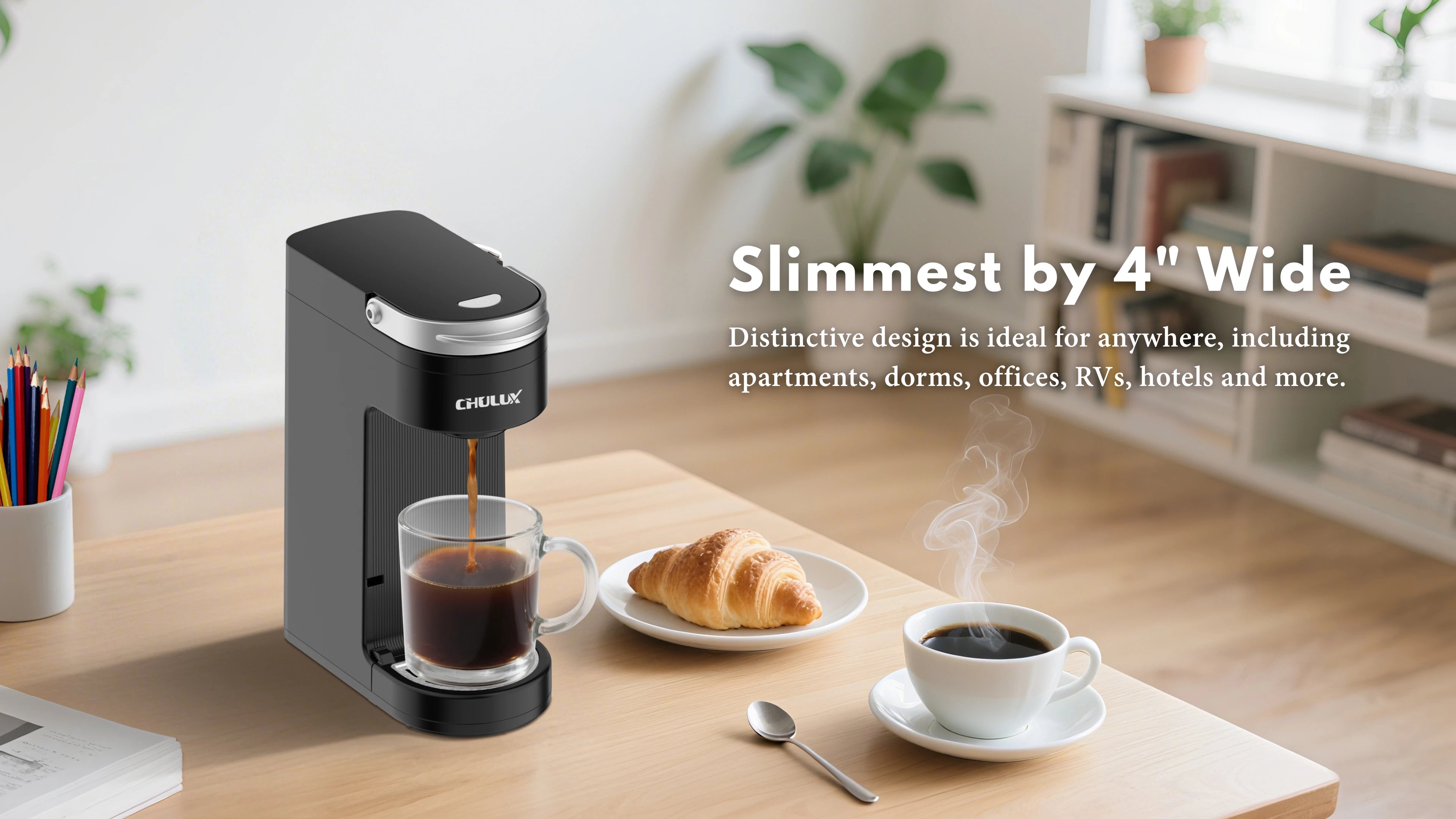 Flexible & Convenient: Customize your coffee by selecting any brew size between 6 to 12 oz. The water fill area is 2 inches deep, making refilling simpler and spill-free. The CHULUX Slim Single Serve Coffee Maker for K Cup provides a fresh water supply for each brew, ensuring a perfect cup every time.